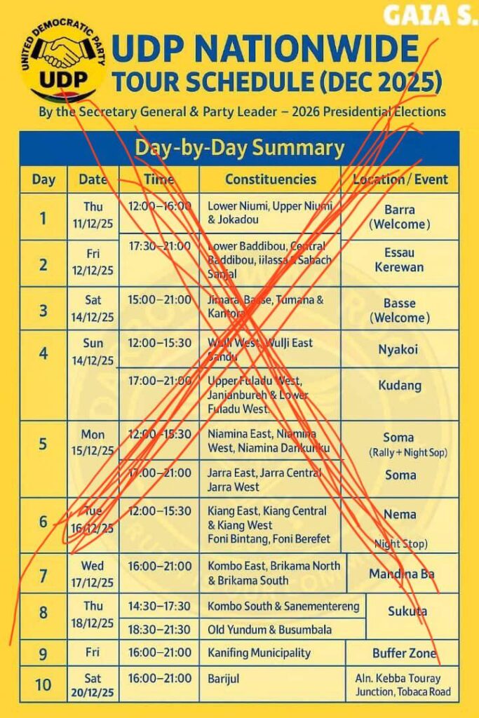A flyer circulating online claims that the United Democratic Party (UDP) will embark on a nationwide tour ahead of the 2026 presidential election, listing constituencies the party is said to visit. The claim is false.