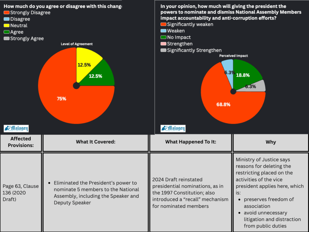 The 2020 draft took away from the president the powers to make nominations to the National Assembly. This was revised and replaced with the text largely similar to that of the 1997 Constitution.