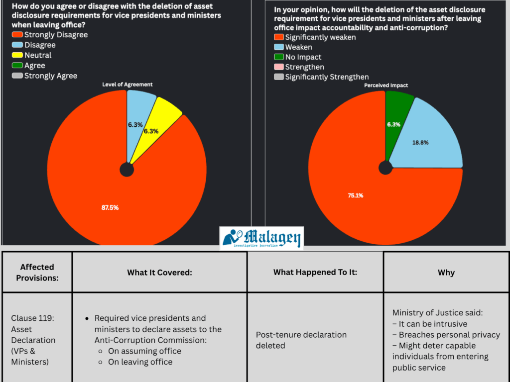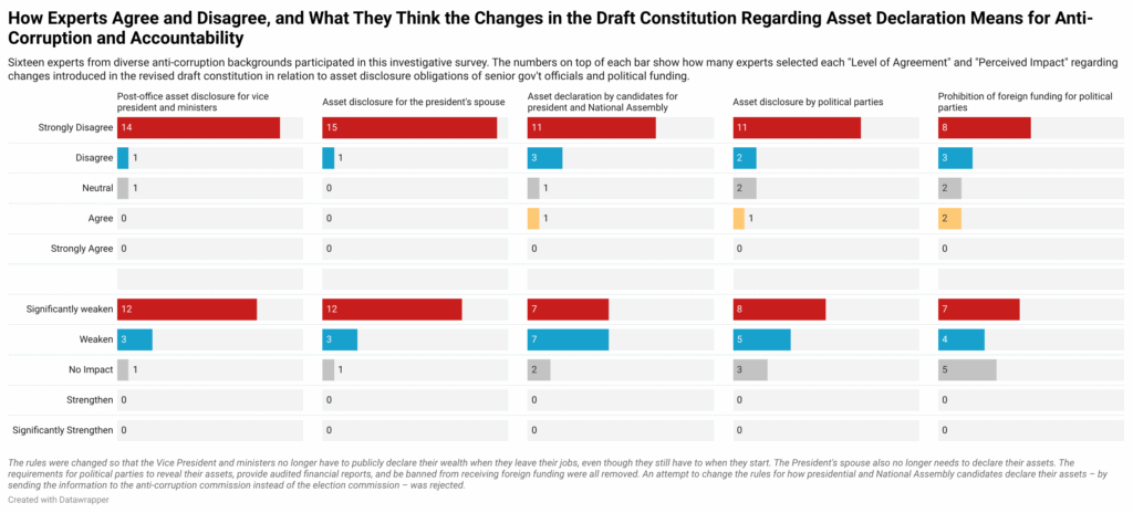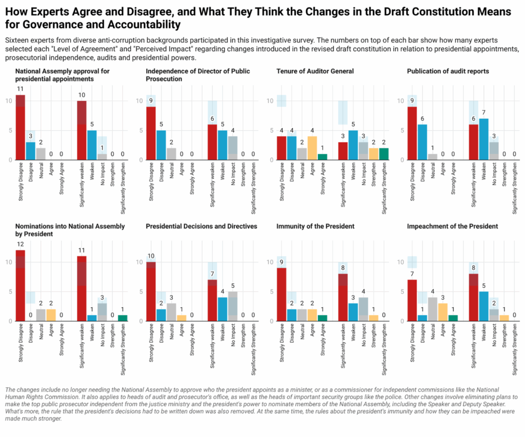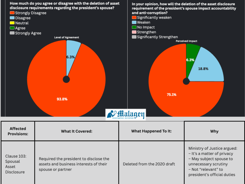 The law forcing the spouse of the president to declare their assets and business interests was also removed, a change not a single expert supported, and only one said the changes would have no impact on anti-corruption and accountability.