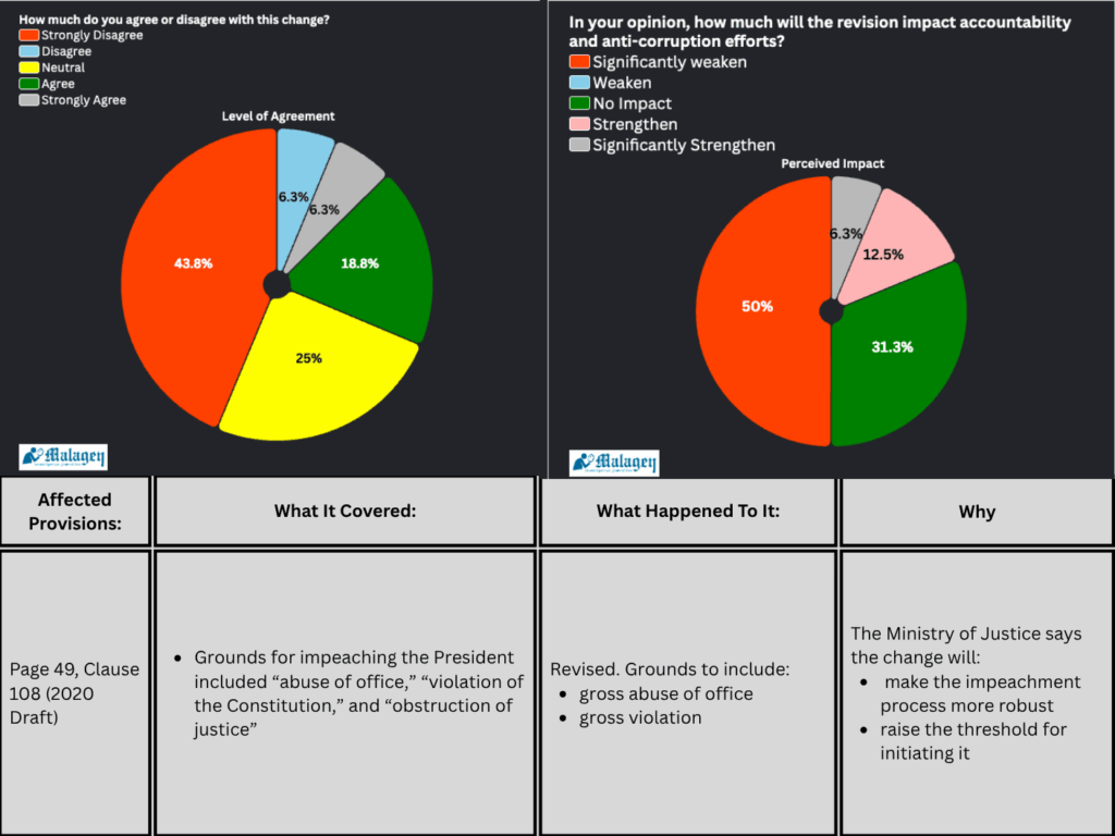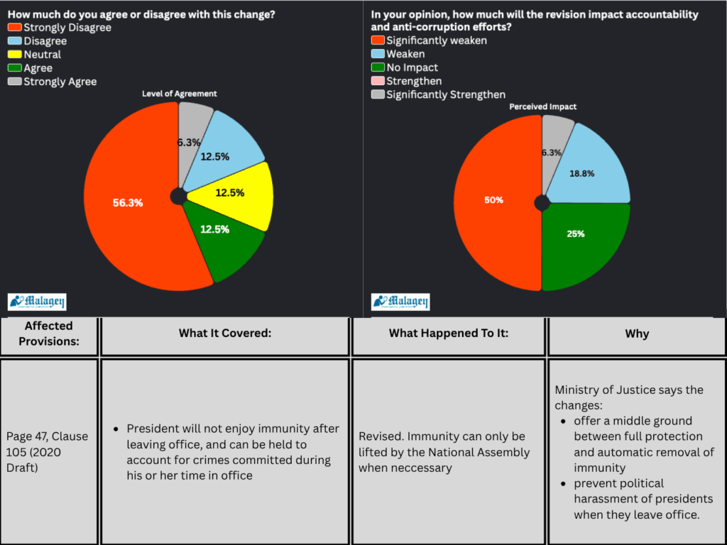 The ministry of justice has meanwhile made issues around immunity and removal of the president “more robust”, an area that has seen improved approval from the experts, though more still believed that the changes undermine accountability.